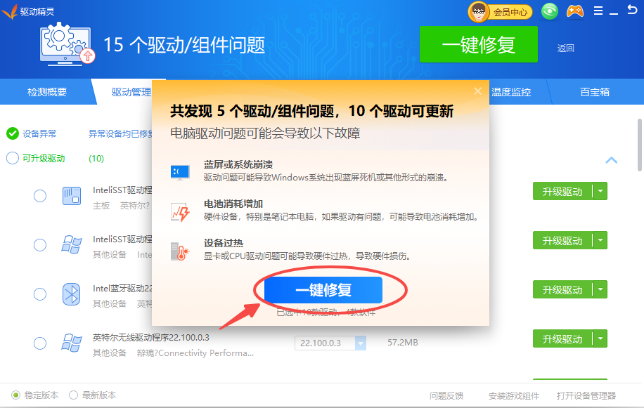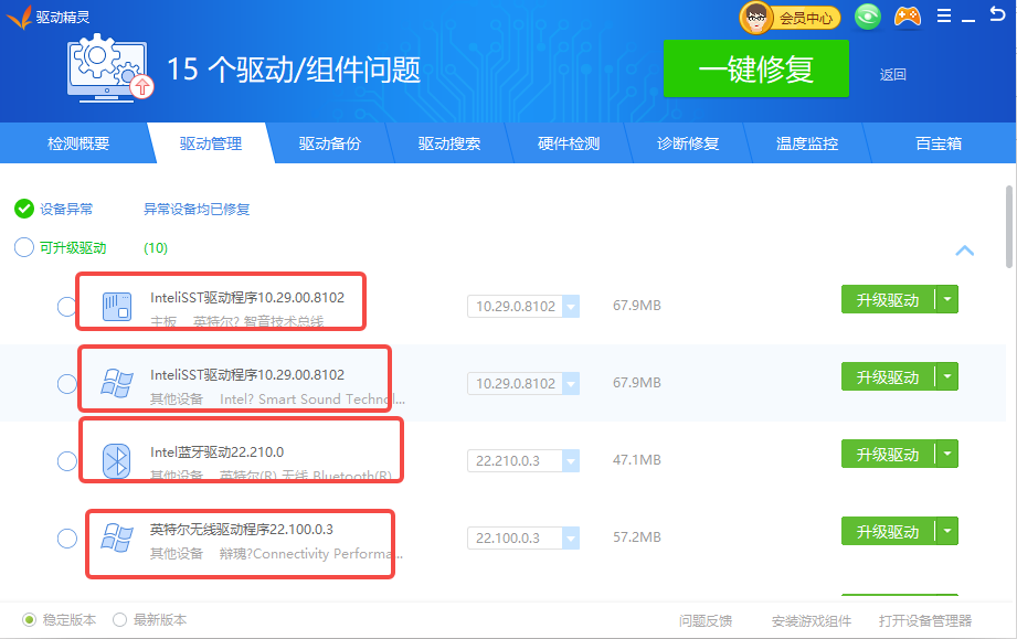 使用驱动精灵,可以一键升级所有硬件驱动,避免手动升级过程中费时费力,还可能出现的驱动版本不对、安装包损坏等问题。