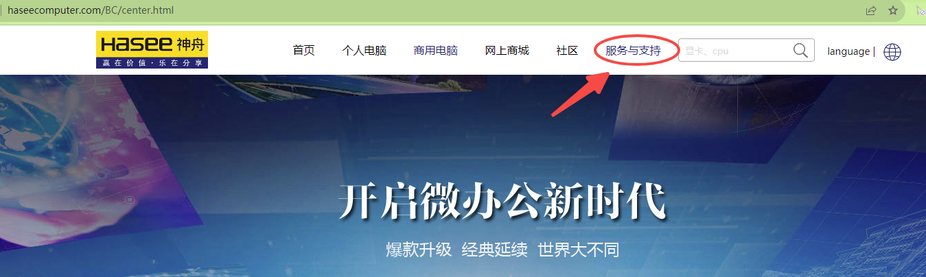 1、进入神舟电脑官网,点击首页上方的“服务与支持”栏;