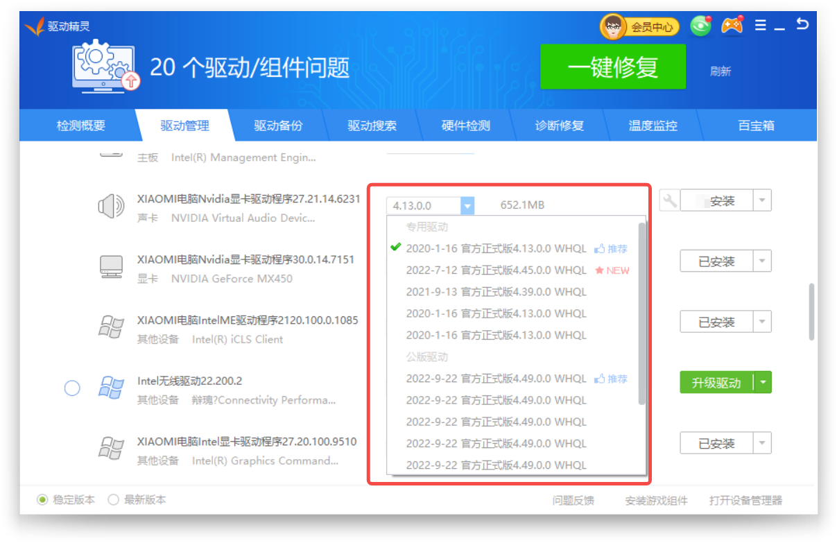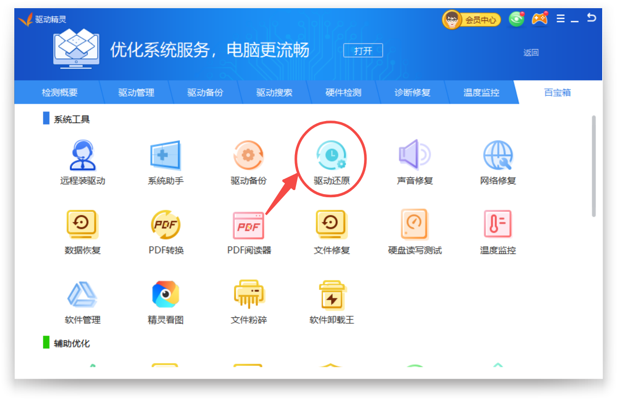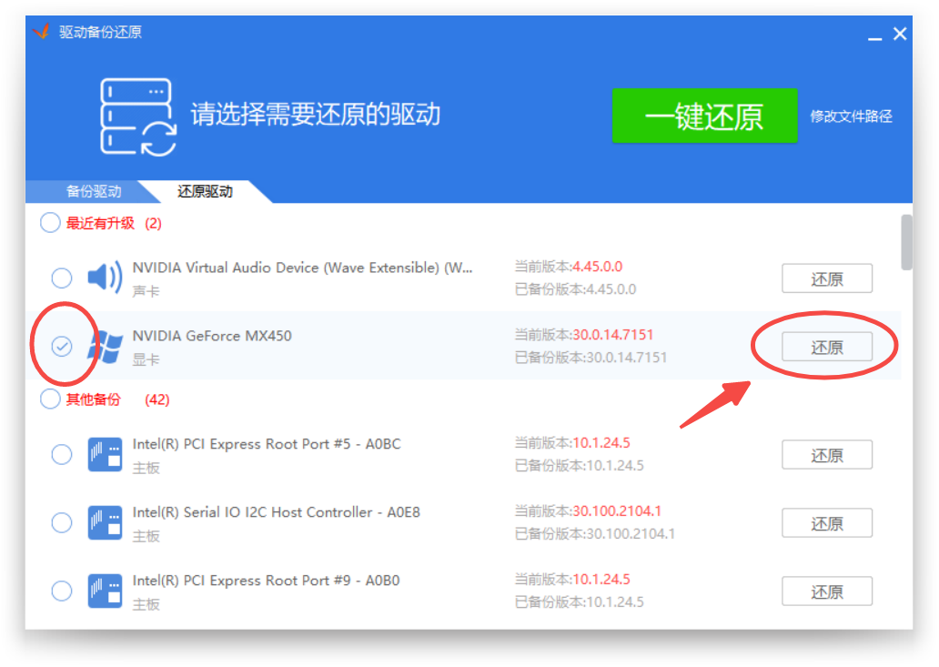 驱动精灵针对电脑驱动提供驱动备份还原功能,可以对显卡、声卡等驱动进行备份,方便驱动异常时,从备份中快速还原,如果显卡驱动在升级前有备份,直接使用还原功能就可以,具体操作如下: