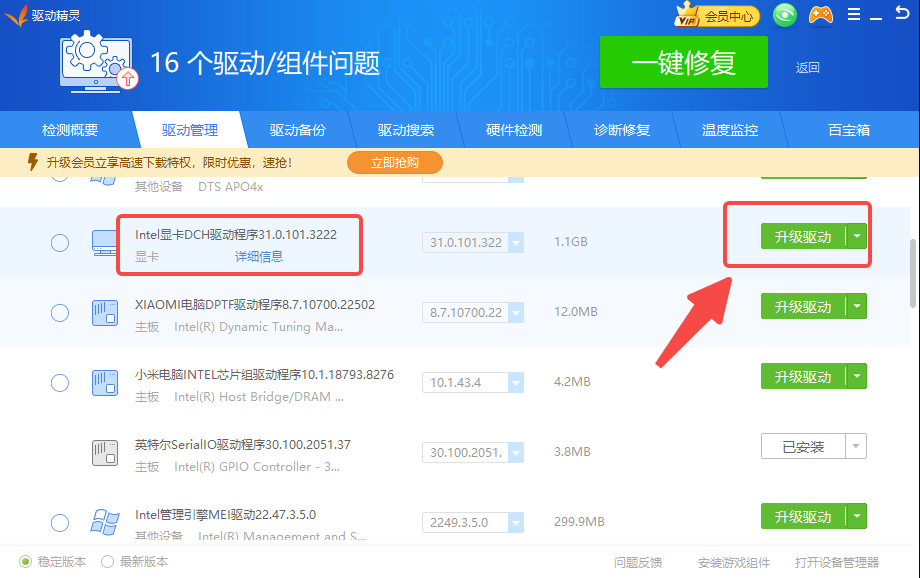 5、也支持单独升级显卡驱动,直接点击显卡后方的“升级驱动”,等待驱动程序下载后安装即可;