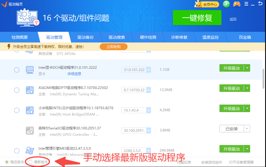 驱动精灵会自动根据电脑显卡的生产厂家和型号,自动匹配对应显卡驱动版本,默认安装稳定版驱动程序,如果想要体验最新版驱动支持手动调整。