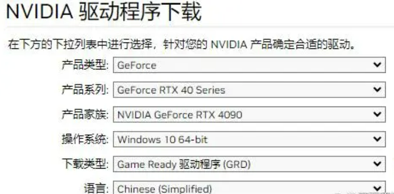 以搭载GeForce RTX 4090的Win10电脑为例,产品类型选择GeForce,产品系列选择GeForce RTX 40系列,产品家族选择NVIDIA GeForce RTX 4090,操作系统选择Windows 10 64位,下载类型选择Game Ready驱动程序(GRD),(如果您主要使用电脑进行特效制作、渲染等工作,请选择Studio驱动程序),语言选择简体中文。点击搜索即可查看驱动信息介绍和下载按钮。
