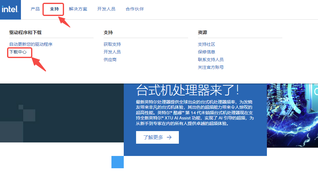 (1)百度搜索“Intel官网”,进入官网,点击页面上方的“支持”,然后点击“驱动程序和下载——下载”;