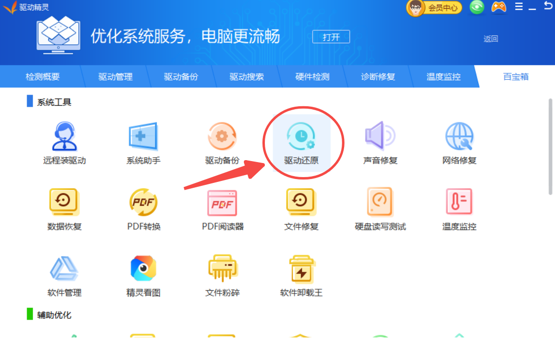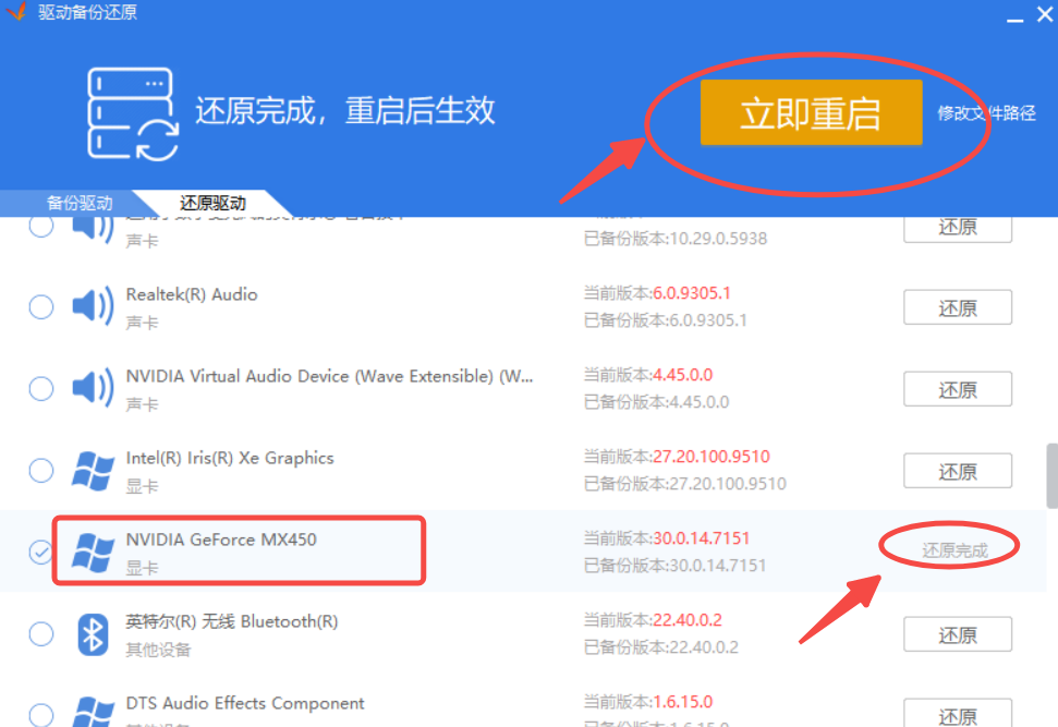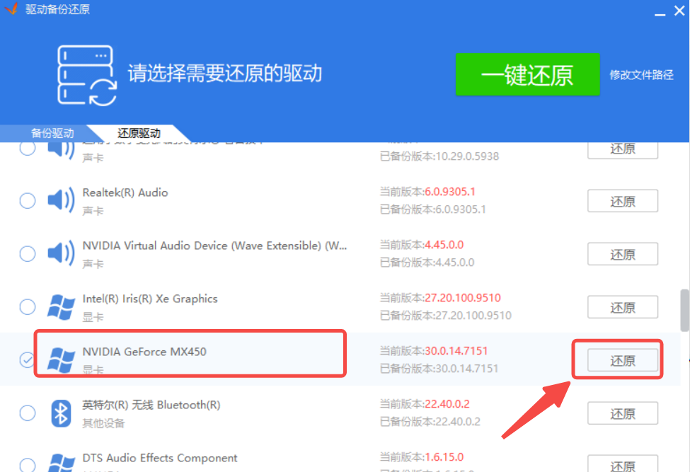 如果此前已经安装了驱动精灵,直接使用驱动还原功能,可以直接恢复到最近备份的显卡驱动版本,操作如下: