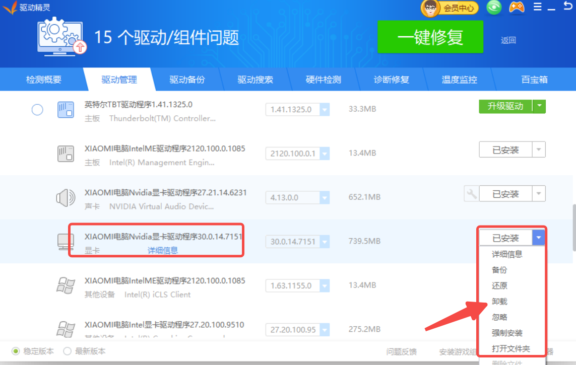 (3)在设备异常中点击显卡驱动安装,支持安装指定版本的驱动,可以根据驱动发布时间选择;