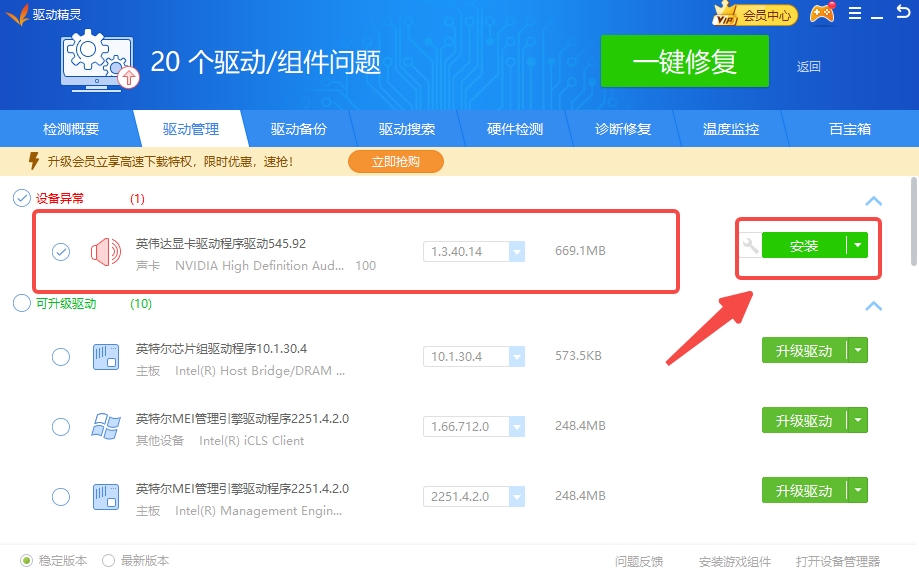 2、在设备异常中,点击:显卡-安装,开始下载最新稳定版驱动;