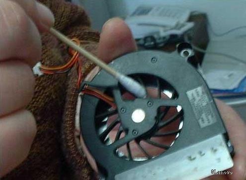 2、散热模组的散热风扇内外的灰尘状况,需要进行全面的清理。可使用的工具:刷子、皮老虎,在外表可适当使用棉签+酒精擦拭。如下图所示: