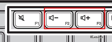 5、这种情况下,可以通过音量控制快捷键调节音量,下图为一台电脑的音量调节键示意图,“Fn+F2” 是减少音量,“F2+F3”是增加音量。不同型号的电脑,其静音快捷键位置、方法可能会有差异,个别用的不是组合键,而是单独的专用按键,但标识基本类似。