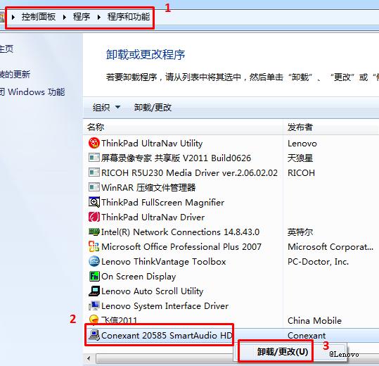 2、如果系统使用的是GHOST克隆的安装方式,则自动安装的声卡驱动程序可能是错误的。或者虽然不是GHOST安装,但也可能安装了错误的声卡驱动。这种情况下,需要完全卸载原有已安装的声卡驱动,并重新启动电脑后再尝试安装。操作步骤:依次单击“开始”、“所有程序”、“控制面板”、“程序”、“卸载程序”,在程序列表中选择已安装的声卡驱动,比如下图中的“Conexant 20585 SmartAudio HD”,右键单击并选择“卸载/更改”,然后按照提示“完全卸载”即可: