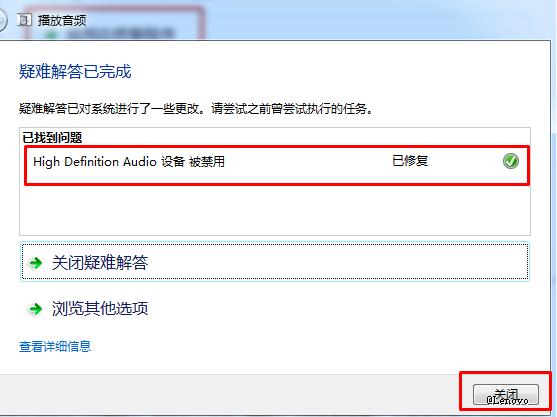 之后按照提示系统会自动查找驱动程序或启动音频服务,出现如下图,提示“已修复”,单击“关闭”即可: