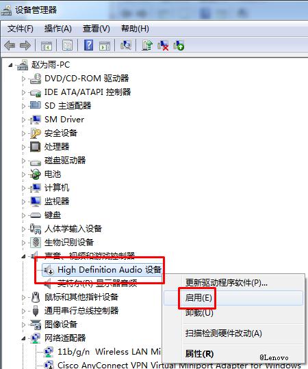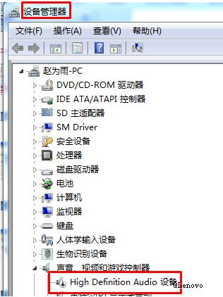 2、或者右键单击“计算机”,然后依次选择“属性”、“设备管理器”,如果看到声卡设备前面有一个向下箭头的标识,则表示当前声卡已被禁用: