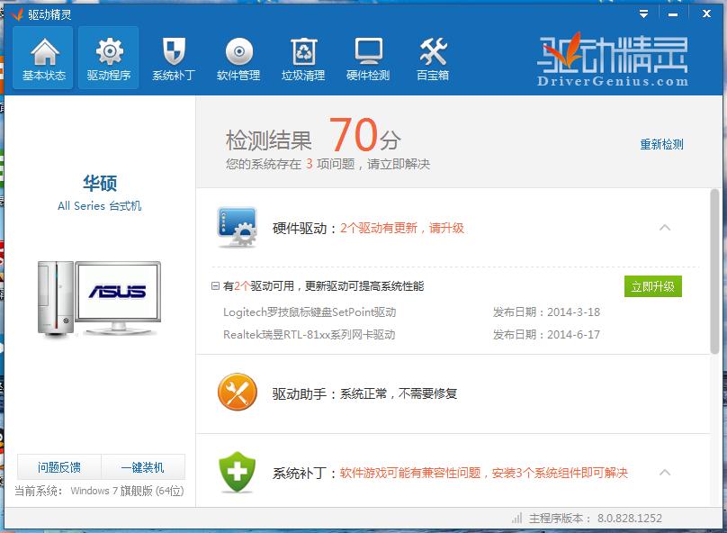 打开驱动精灵—首屏一键体检—更新显卡驱动即可。(图供参考)
