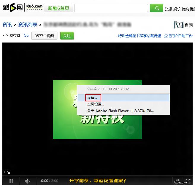 (2)打开浏览器,访问视频网站,在 Flash 视频区域点击鼠标右键,在弹出菜单中选择“设置…”。如下图所示: