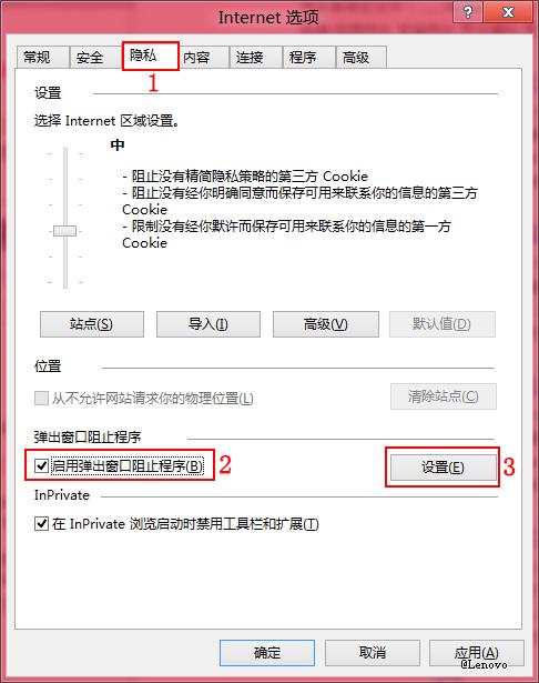 3、在弹出的 Internet 选项窗口,点击“隐私”选项卡,找到并勾选“启用弹出窗口阻止程序(B)”选项后点击“设置(E)”按钮。如下图所示: