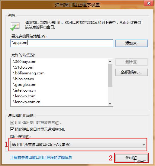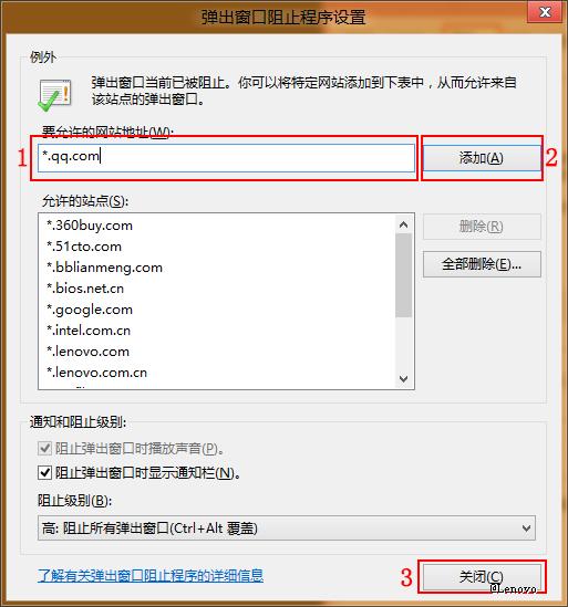 5、对于部分情况下,如果该设置影响了部分网站的访问。可以在“要允许的网站地址(W)”中键入需要弹出窗口的地址后点击“添加(A)”按钮,后点击“关闭(C)”按钮即可。如下图所示:
