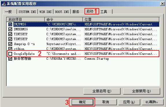 2、在弹出的设置界面,点击“启动”选项卡,然后在列表中根据实际需要,找到需要禁用的开机启动项目(如:GoogleUpdate),在其左侧取消勾选即可,后点击“确定”按钮结束设置。如下图所示: